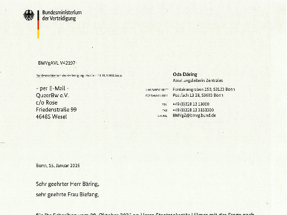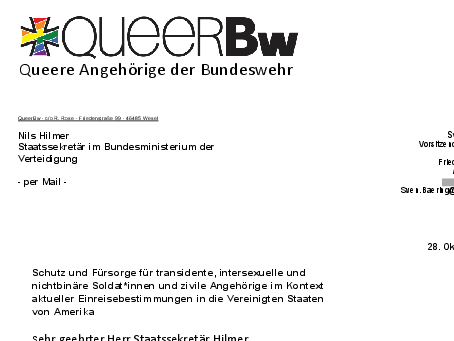 Wir möchten ausdrücklich betonen, dass seitens QueerBw eine klare Erwartungshaltung besteht, dass sich das Bundesministerium der Verteidigung und die Bundeswehr aktiv, sichtbar und vorausschauend für den Schutz ihrer transidenten, intersexuellen und nichtbinären Soldat*innen und zivilen Angehörigen einsetzen.